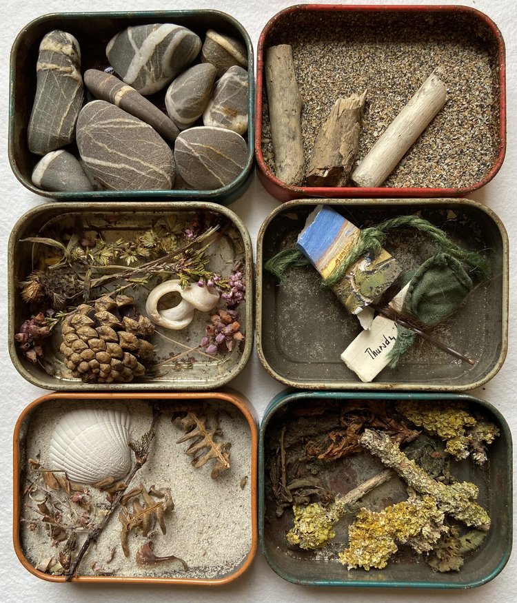 But when I lift the lids, each reveals a bright reminder of a time and place in concentrate: sand from my childhood beach; rosehips and dried flowers from the lane I played along for my first nine years before my single mother remarried and moved us away; slate and moss from the stream my husband dammed as a small boy. A deliberate trip made to recover each one.