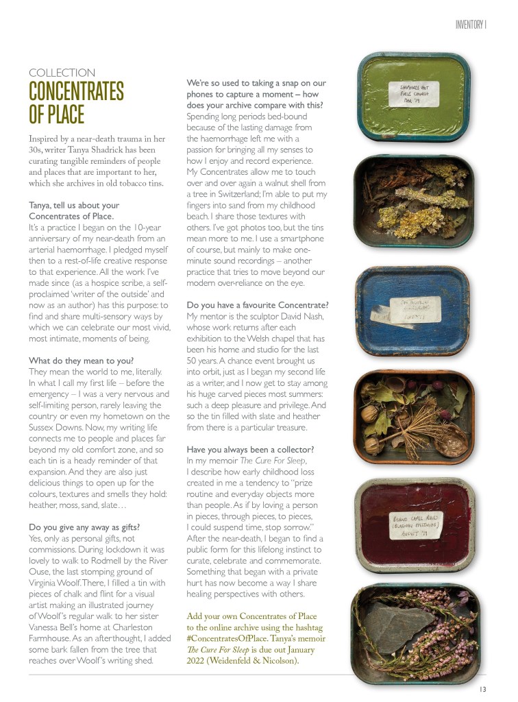 “Last spring on Twitter I learned about the artist Tanya Shadrick‘s Concentrates of Place project, a beautiful way to make memories tangible by filling small tins with items from particular places and times. Tanya describes her Concentrates of Place as a ‘deliberate way of honouring places and people.’